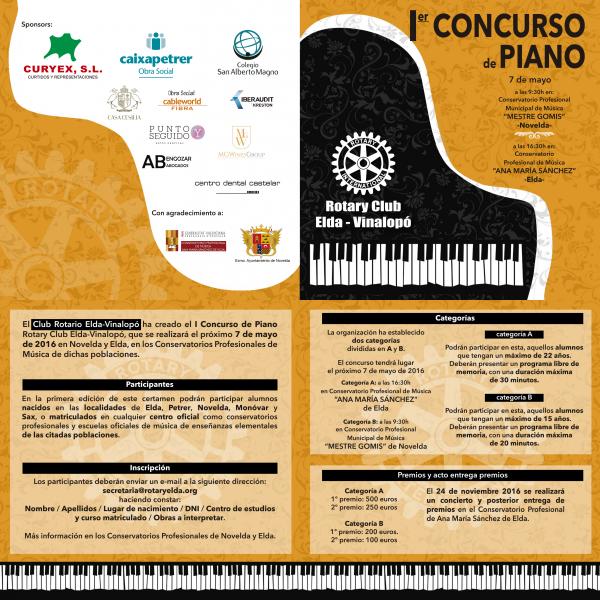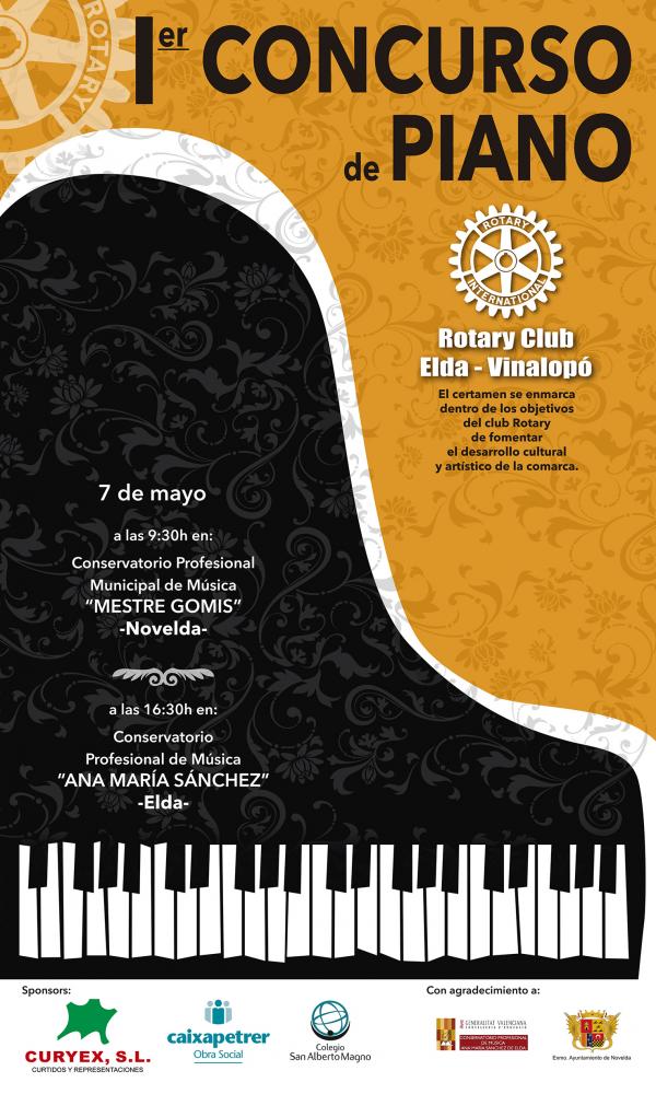 El próximo día 7 de Mayo tendrá lugar el 1er Concurso de Piano Rotary Club Elda-Vinalopó, dirigido a alumnos de nuestra demarcación geográfica (Elda, Petrer, Novelda, Monóvar y Sax).